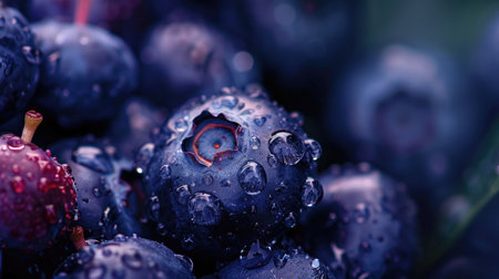 Incredible sight of purple blueberries shimmering in drops of water. Wet drop blueberry background