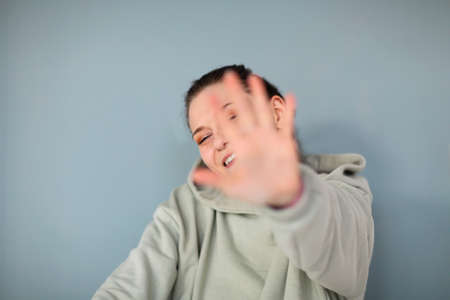 Confident fearless Caucasian man makes stop gesture, palms forward and looks seriously into camera. Studio, gray background.