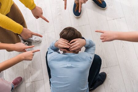 top view of cruel schoolkids pointing with fingers at bullied classmate