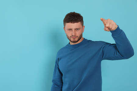 High angle view of handsome man in casual clothes pointing at camera, hand in focus, on light background