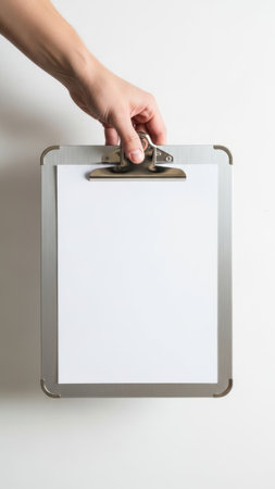 Hand holding clipboard with paper isolated on white background