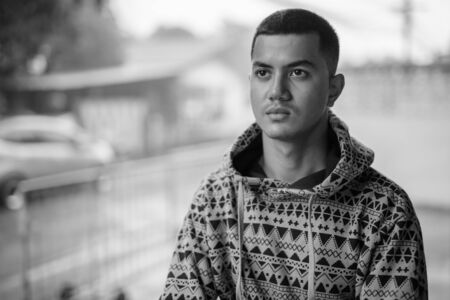Close up of young handsome Indian man thinking while looking at distance in the park