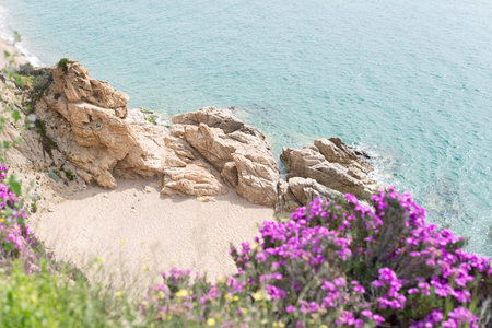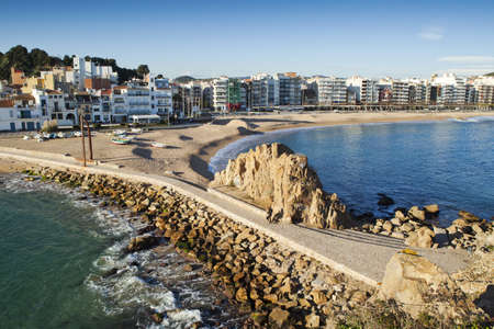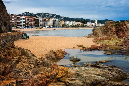 Beach and rocky shore in Lloret de Mar, resort town on Costa Brava in Catalonia, Spain