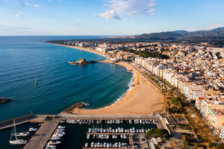 Drone view of coastal Spanish town of Blanes overlooking port, sandy beach and Sa Palomera Rock