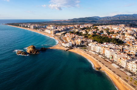 Aerial view of Blanes on Mediterranean coast overlooking Sa Palomera Rock and sandy beach