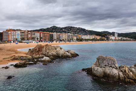 Lloret de Mar beach cityscape in Spain. View on a cloudy, rainy day.