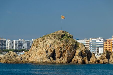 panoramic view of seashore with rock cliff and a town on background in Lloret de Mar, Catalonia, Costa Brava, Spain