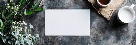 A cozy arrangement of coffee, an empty card, and greenery on a rustic tabletop creates an inviting atmosphere for gatherings.