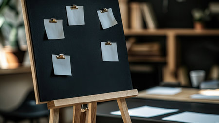 A black detective board on a wooden easel, with empty papers pinned, ready for a brainstorming session.