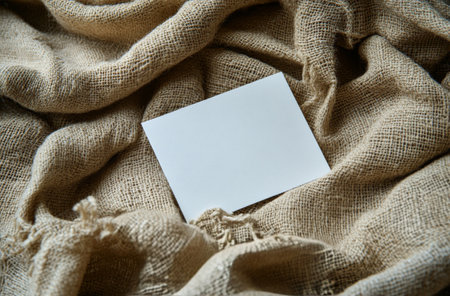 A blank card is placed on textured burlap fabric, showing a simple and rustic aesthetic. The card highlights the natural fibers surrounding it in a neutral and calm setting.