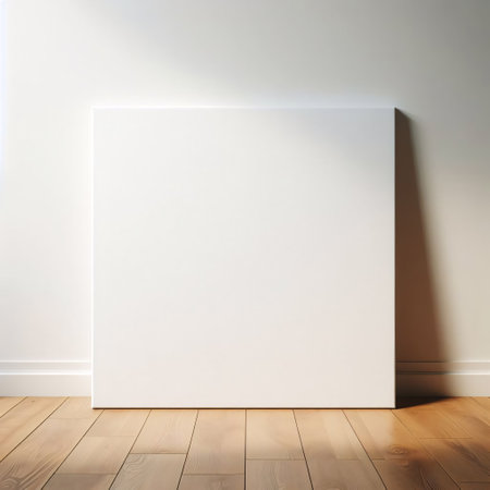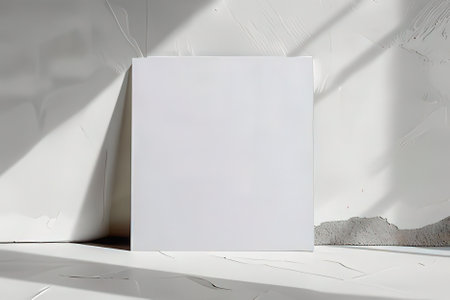 A blank canvas rests upright on a wooden floor positioned against a dark wall. Sunlight filters through casting unique shadows across the surface creating an inviting atmosphere.