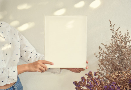 Blank canvas in female hands, picture mockup. Woman hanging canvas on white wall in interior with dry grass and beige curtains