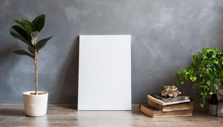 A clean and minimalist workspace with a blank canvas. plants. pencils. and a vintage camera. Perfect for showcasing your designs. products. or branding.