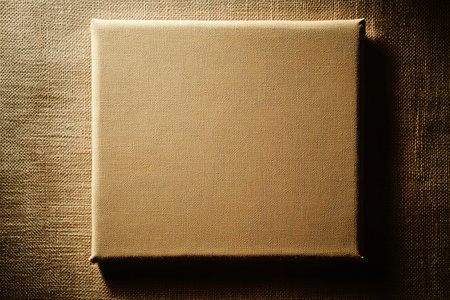 A square blank canvas sits on a textured gold fabric, illuminated to create a warm artistic vibe, perfect for displaying artwork or design concepts.