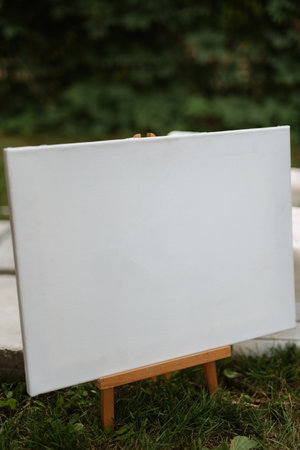 Blank Canvas on Wooden Easel Against Artistic Textured Background.