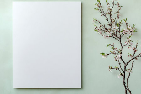 a blank white poster board sits on a table, accompanied by delicate pink flowers. this isolated mockup or transparent photo showcases a minimalist painter's style, with a dark gray and silver color scheme. the 8k resolution and uhd image capture the intricate details of this still life realism piece by serge marshennikov, inspired by japanese minimalism. ai generated