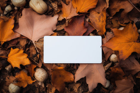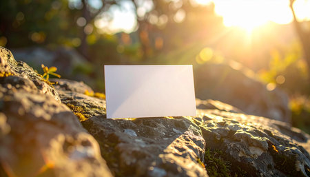 Blank white card on textured rocks with golden sunlight and bokeh. Clear details and vibrant colors enhance v...