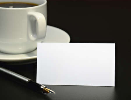Business card and a coffee cup on a dark desktop. With a place for drawing of your text/