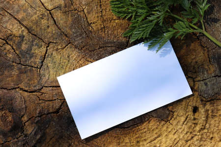 Blank paper card on wooden stump. Summer stationery still life with mock up invitation card and green leaves on wood textured background. Top view, copy space
