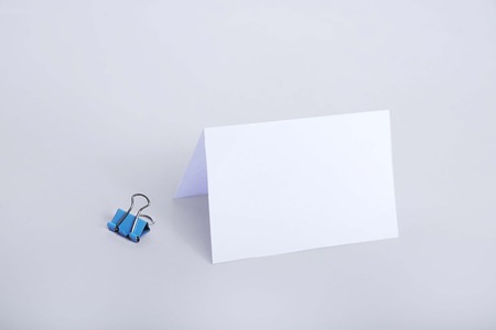 Picture of blank invitation greetings card with paper clip. Isolated on the white background.