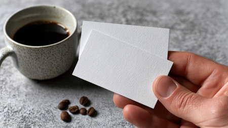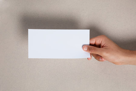A hand grasping a blank white card with a simple black outline, set against a clean white background.