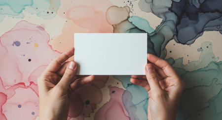 Hands gently hold a blank white card, a perfect space for your message or design, set against a backdrop of soft, flowing alcohol ink art in calming pastel and deep tones. Ideal for mockup, branding