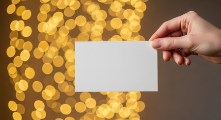 Blank white card held by hand against golden bokeh lights background for festive message or elegant minimalist copy space concept.
