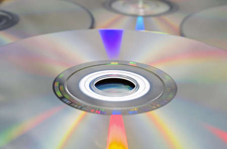 Exploring the intricate textures and reflective surfaces of compact discs in vibrant light