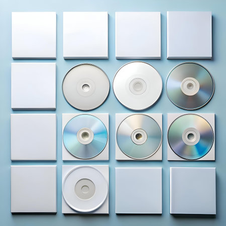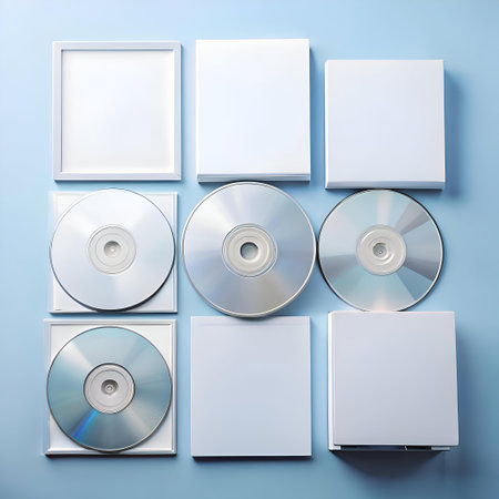 A minimalist arrangement of blank CD cases and shiny CDs against a light blue background. Perfect for showcasing product packaging. branding. or digital content.