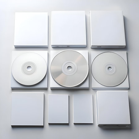 Blank CD cases with silver discs for product mockups and design presentations. Perfect for showcasing your brand or creating visually appealing marketing materials.