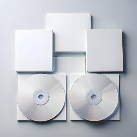 A simple. minimalist composition of blank CD cases and discs. perfect for showcasing your own design or branding.