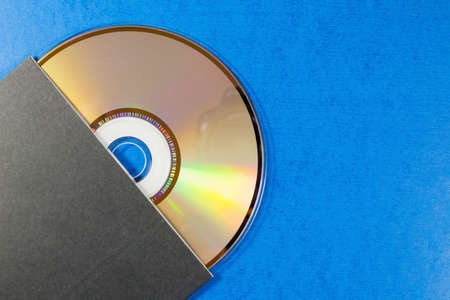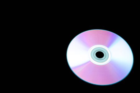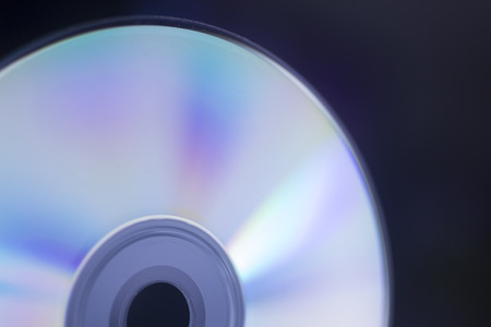 Close-up semi-abstract macro photo of shiny underside of cd dvd cd-rom disk reflecting multicolors in blue purple tone set against black studio background. Artistic color digital photo with shallow depth of focus.