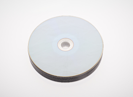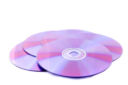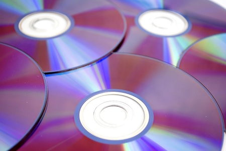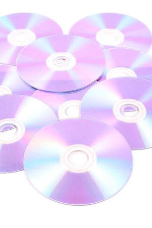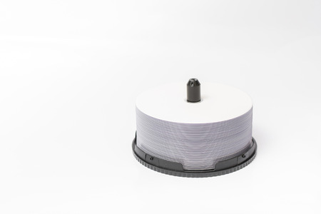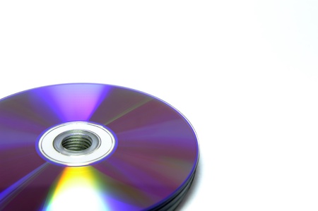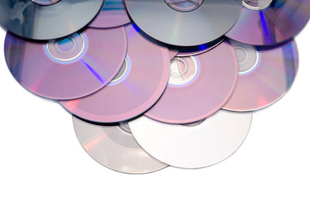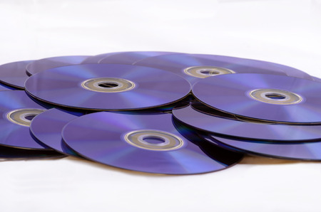 Closeup isolated on white background of a stack compact disc CD and DVD. Pile of cd's, dvd's discs
