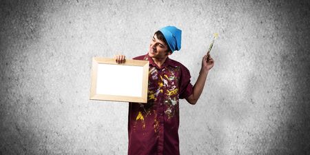Young handsome painter artist holding paintbrush and blank canvas in frame. Portrait of happy painter on gray wall background. Creative hobby and artistic occupation. Art school advertising.