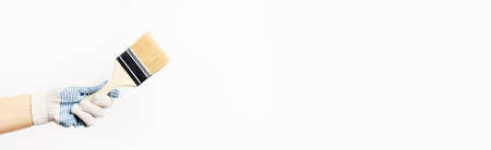 hand worker holding brush painting white on the wall house, diy and repair concept