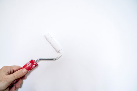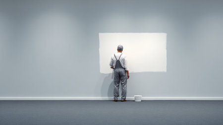 a roller painting a white wall with gray color, offering ample copy space for text, showing the skillful execution of the task