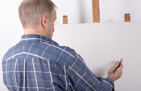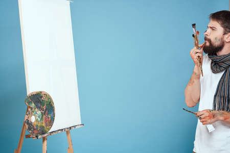 Painter holding a palette filled with vibrant colors is preparing to create a new masterpiece on a pristine, blank canvas