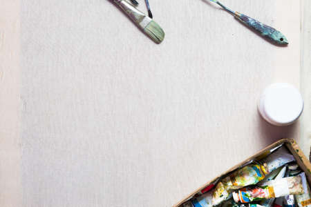 Handmade decore workplace flat lay. Oil paints, brushes, canvas. Artists equipment assortment background. Drawing lessons, art school, young painter, creativity, DIY concept
