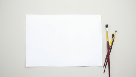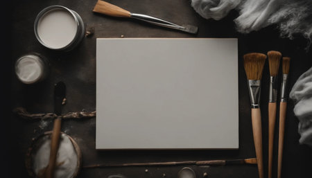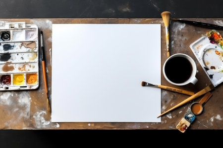 A white sheet of paper on a table with art supplies, top view, Generative AI