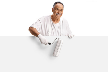 Color man. Man painter decorator isolated on white. Handy man hold paint roller. Work man wear working clothes. Renewal and redecorating. Renovation and repair. Decorating work