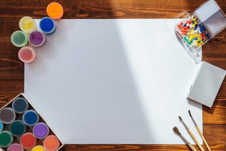 Creative artist workplace flat lay, mockup. Top view on table with blank sheet of paper, paintbrushes and dye palettes. Art, workshop, painting, drawing, craft, creativity concept. Copy space.