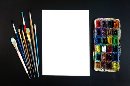 Top view of blank white sheet of paper and artist brushes on a dark background