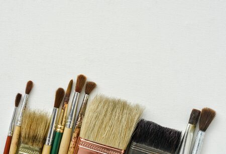 Paint brushes of different types and sizes on white canvas painting frame, copy space.