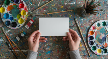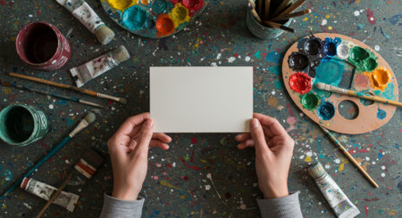Top view: Hands hold a blank card over a vibrant paint-splattered surface, surrounded by brushes, tubes, and colorful palettes. Capturing creativity, art, and the start of an idea or message.