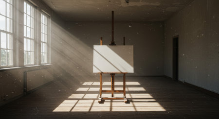 Sunlight streams through a large window onto an easel with a blank canvas in an empty, atmospheric room.