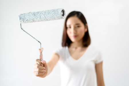 Selective focus at painting roller in young Asian woman hand in front of a reparing old wall in a bed room.