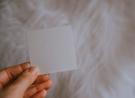 Close up picture of Hand holding a blank white card on white background. woman keeping blank business card on white isolated studio background, copy space, cutout.