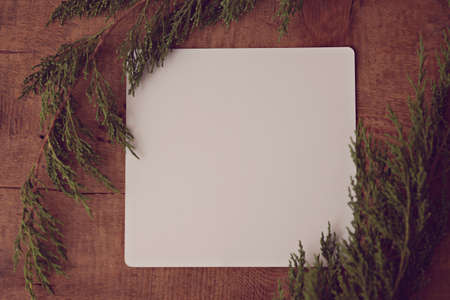 Blank card on spruce branches, top view with space for text. Christmas tree
