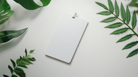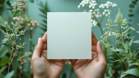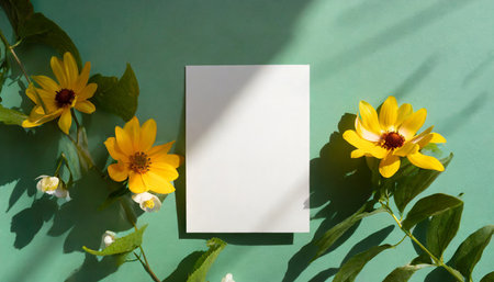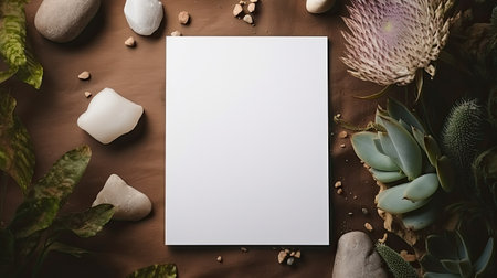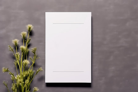 mockup card with plants. invitation card with environment and details Mockup with postcard and flowers on white background.