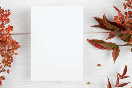 Autumn blank card mockup for thanksgiving day, DIY invitation, holidays preparation and creativity layout. white mockup greeting card, flat lay, 5x7 ratio, similar to A6, A5